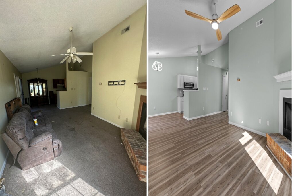 This property smelled bad and looked worse—dirty carpets, damaged walls, and zero charm. After a full remodel, the living room shines with modern updates and feels completely brand new. Another example of how Sell House Company transforms neglected houses into beautiful homes in Eastern North Carolina.